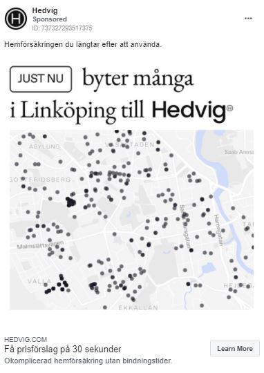 Hedvig har en extremt bred produkt som rör samtliga hushåll, med fokus på hemförsäkring. Detta ger både stora möjligheter men också en utmaning i att få annonserna att vara relevanta. Hedvig har hittat sitt koncept i att använda kartor. På facebook/instagram är det ett utmärkt sätt få annonserna att bli relevanta trots en bred målgrupp. Hedvig är inte den enda som upptäckt detta utan det finns fler exempel både internationellt och nationellt.