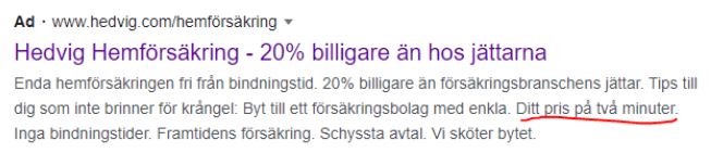 Här skulle Hedvig med relativt enkla medel kunna sänka sin kostnad genom att anpassa annonsen bättre efter sökordet. D.v.s. istället för att prata om hemförsäkring generellt när man söker efter hemförsäkring för lägenhet kan de rikta annonsen mer specifikt mot lägenhet.